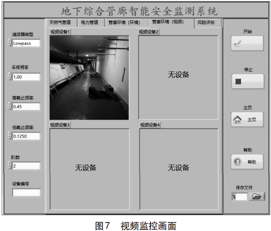 对于数据处理终端,通过其微处理器(MCU,采用STM32单片机搭建)将数据采集端发送的数据接收,接收到的数据实时传输到上位机软件进行进一步的处理。其中,压力及流量数据可对天然气管道的异常情况进行实时显示及风险评估,同时还可利用声波数据的相关分析对天然气管道的泄漏位置进行初步计算;电压及电流数据可对电力管道的异常情况进行实时显示及风险评估;人员入侵数据(包括摄像头的视频数据及红外传感器的红外数据)可通过视频的方式在软件界面实时显示。通过综合分析地下综合管廊的天然气管道异常检测情况,电力管道异常检测情况,并结合温度及甲烷浓度数据,可对地下综合管廊的安全性能进行风险评估,具体介绍如下。