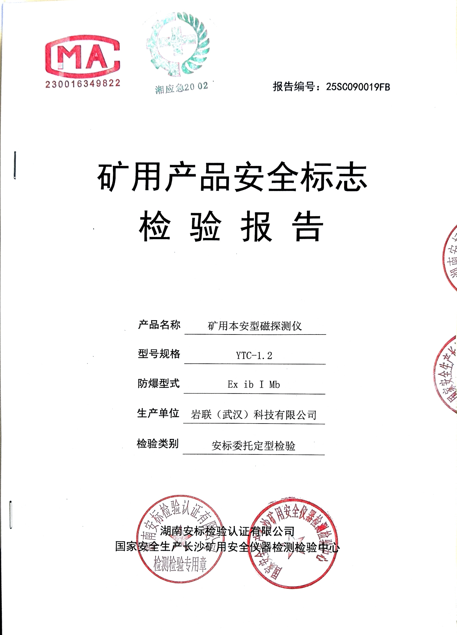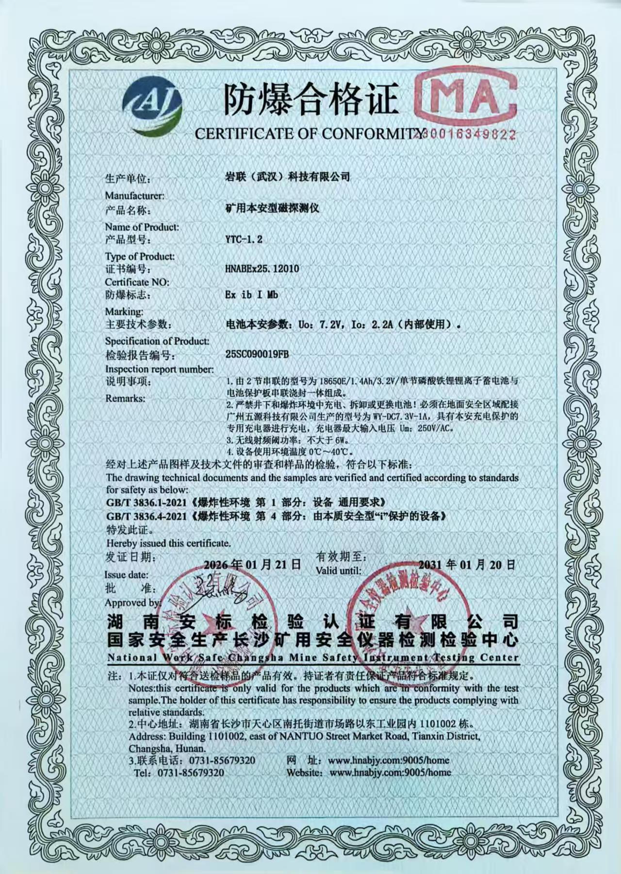 近期,我司自主研发的YTC-1.2矿用本安型磁探测仪正式获得矿用产品安全标志证书认证!标志着该产品在安全性、可靠性和专业性方面全面符合国家矿用产品标准,可为矿山、隧道等高风险场景提供更精准、更安全的检测监测服务。