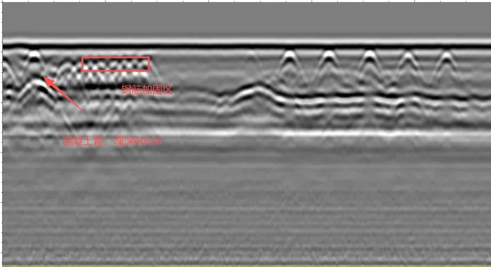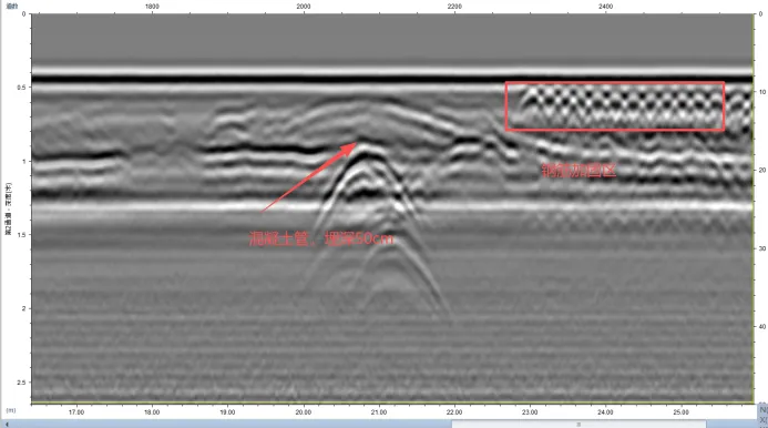 共探测到两根混凝土管,第一根埋深40cm,第二根埋深50cm,同时也检测到道路的钢筋加固区,月牙形成像清晰可见。- 现场影响因素:现场检测条件不同、测线定位差异、桩号定位误差等;