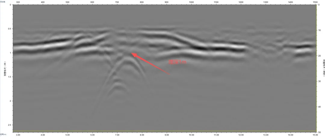 对某学校采购的600M雷达验收,在混凝土路面进行管线探测。土层情况:第一层土,0-0.3 m,混凝土层;第二层土,0.3-0.8 m,杂填土层;第三层土,0.8-1.3 m,天然土层;第四层土,1.3 m以下,均质土。