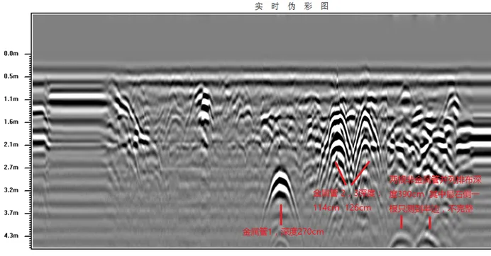 总共测试到5根管线,但是其中,最右边一根非金属管线显示不完整,从左往右五根管线排布如下:- 金属管2,埋深114cm,金属管3埋深126cm,两根基本排布在一起