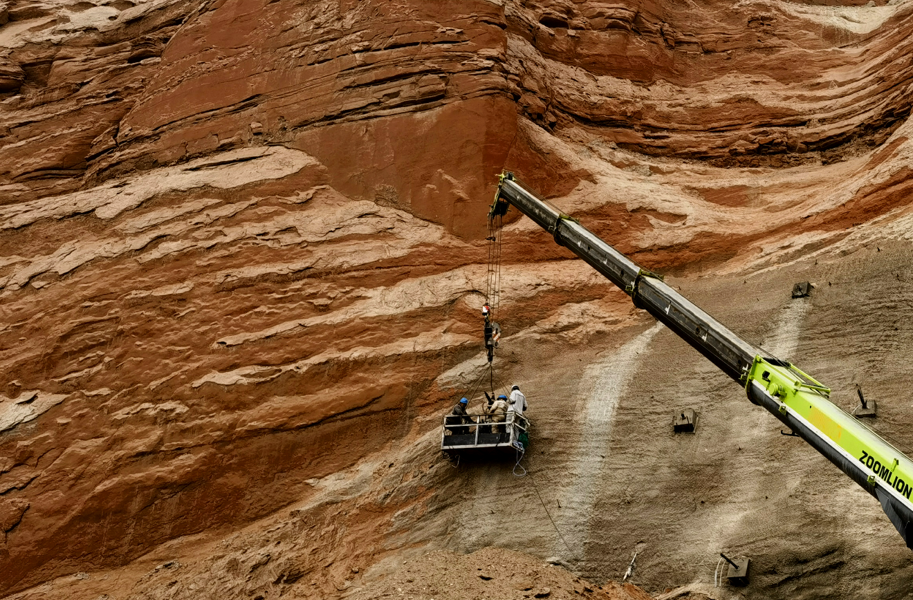 作品介绍:画面呈现工程场景,起重机伸展长臂,载着工人的吊篮悬于岩壁前。工人们在险峻环境中作业,展现出工程人不畏艰难、为建设拼搏的姿态,传递出积极向上的力量。